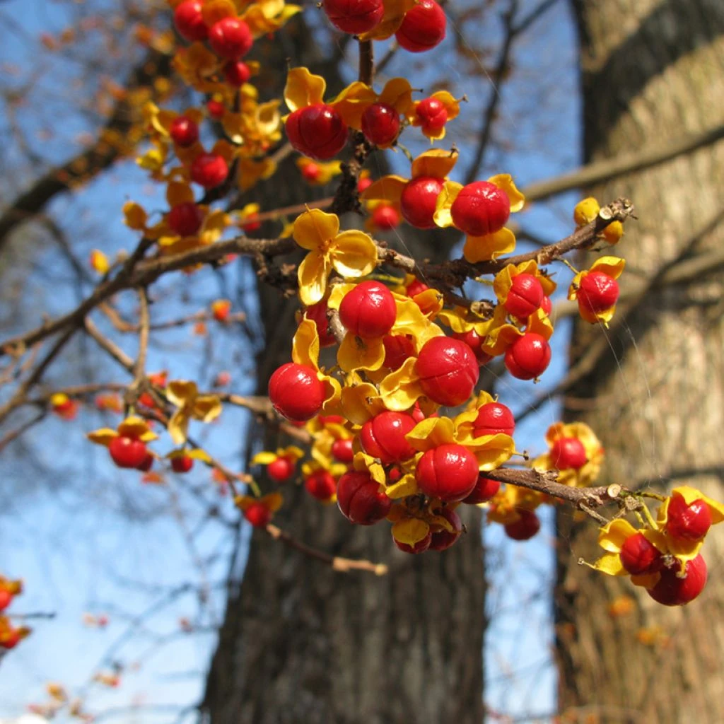 Le Celastrus orbiculatus Diana est un vigoureux arbuste grimpant, aux tiges volubiles, dont la gĂ©nĂ©reuse fructification reste dĂ©corative depuis la fin de lâĂ©tĂ© jusque tard en saison. Ces fruits sont rĂ©unis en petites grappes bicolores, les capsules jaunes sâouvrant sur une perle rouge-orangĂ©. Ces jolis fruits vous assureront la visite des oiseaux qui en raffolent, mais ne les imitez pas, la graine est toxique. Le feuillage, caduc, prend une belle teinte jaune en automne. ‘Diana’ est un bourreau des arbres femelle qui nĂ©cessite la prĂ©sence d’un cultivar mĂąle pour fructifier.